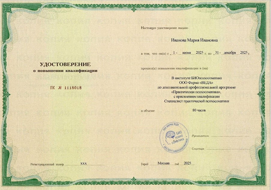 Сертификат — подтверждает факт прохождения обучения в институте БИОпсихосоматики и то, что вы прослушали курс.